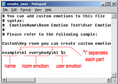 EmotionName\Text for room emote\Text for single user emote.