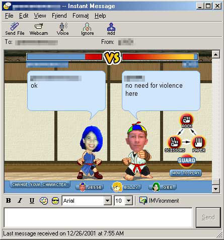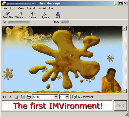 ![]() ![]() To make your own modifications go to C:\Program Files\Yahoo!\Messenger\IMVCache\ and edit the gif images of any of the IMVirornments. I used Adobe ImageReady 2.0.